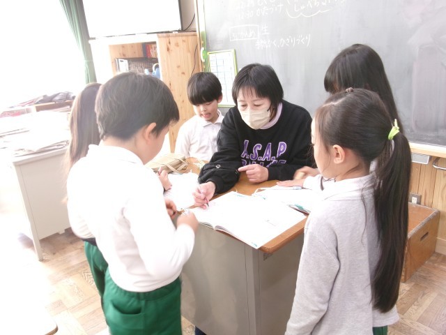 2年1組がプリントを使って算数の問題を解いていました。教師の周りに集まってやり方を確認している子たちもいました。