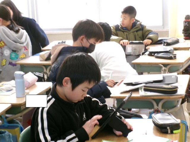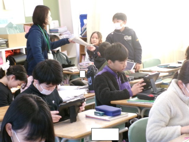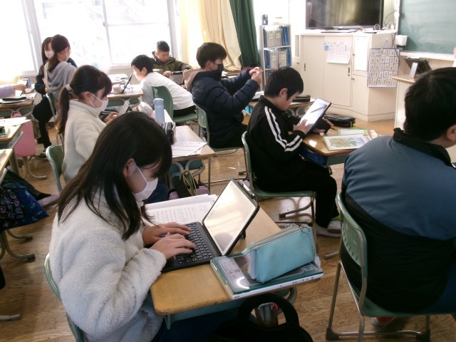5年1組では、国語で、「どう考える?もしもの技術」の単元を学習していました。「もし心の声スピーカーがあったら」というテーマで自分の考えをタブレットに打ち込み、友達と考えを共有していました。
