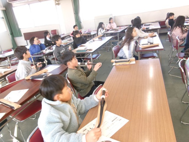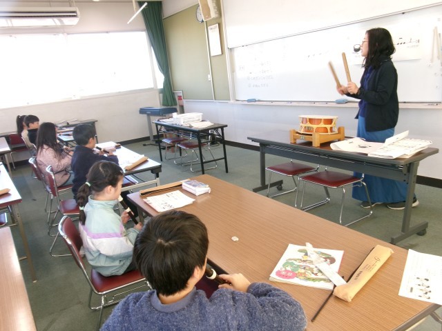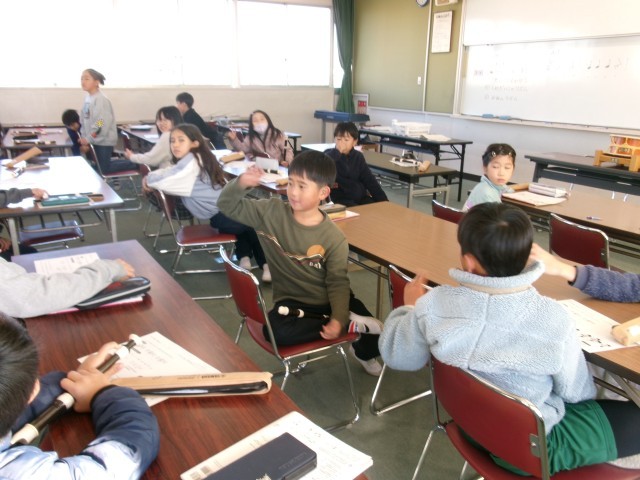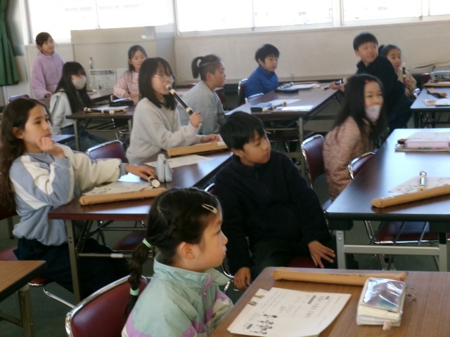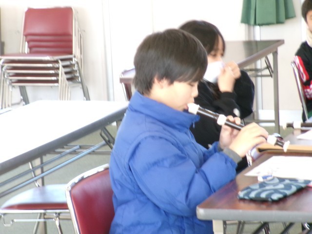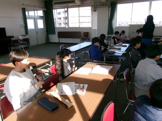 3年4組がリコーダーで節づくりを行っていました。自分で作った節を6人でつなげて1つの曲にしていました。途中から教師の太鼓も加わり格好良い演奏がでで上がっていました。
