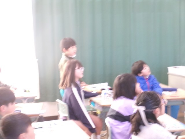 3年2組では、外国語で、もの当てクイズをしていました。カメラレンズの穴から見える形から想像したり、ALTのヒント「White」「Cute」などのヒントから考えたりしながら楽しく学習していました。
