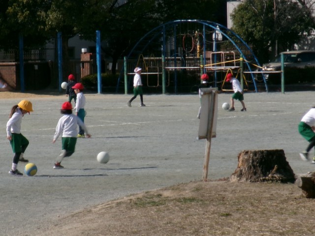1年2,3組が運動場で一緒にボールけり遊びをしていました。ボールをよく見てけっていました。