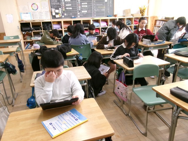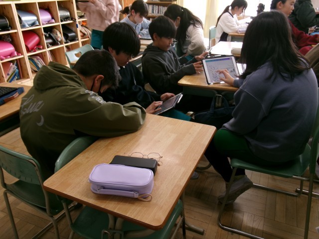 6年2組では、総合的な学習の時間で、まとめをしていました。友達と話し合っている子、一人でまとめに取り組む子など自分自分の方法でまとめを行っていました。
