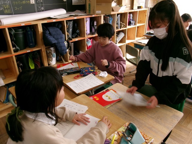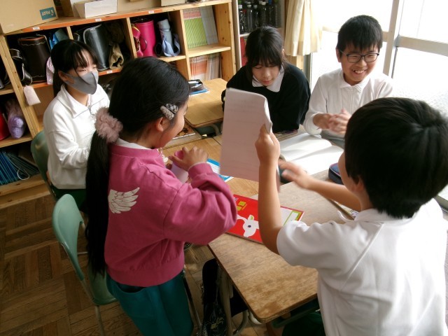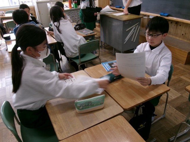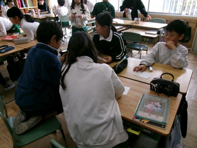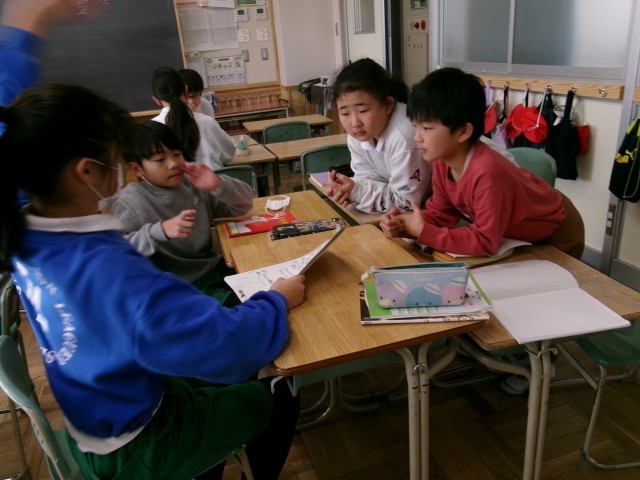 4年4組では、「調べたことを発表しよう」の学習をしていました。集めたアンケート用紙で項目ごとに選んだ人数をカウントする作業をなかよく進めていました。