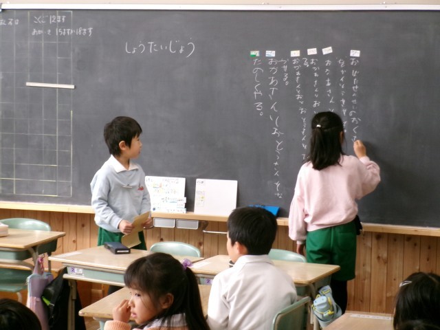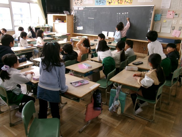 1年2組では、学習発表会をどんな風に頑張りたいか目標を話し合っていました。一通り意見が出たところで、みんなで読み上げ確認をしていました。