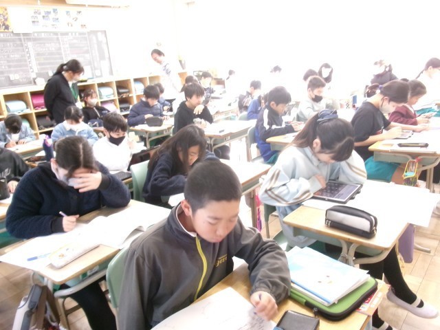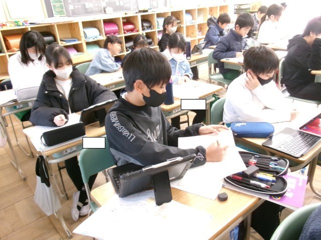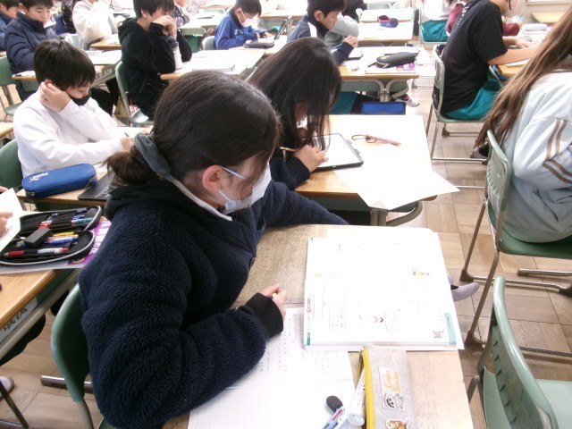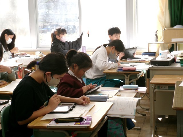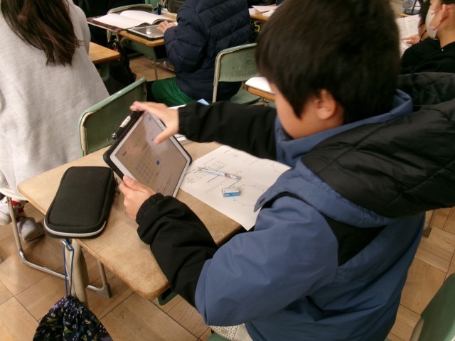 5年3組では、割合の学習をしていました。割合の出し方を確認すると、タブレットのアプリで計算をし、答えを求めていました。