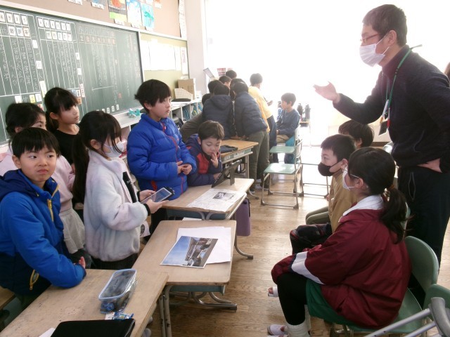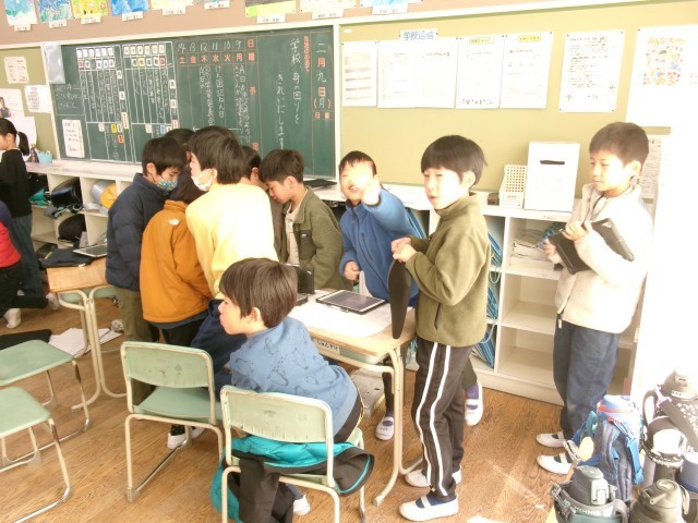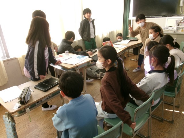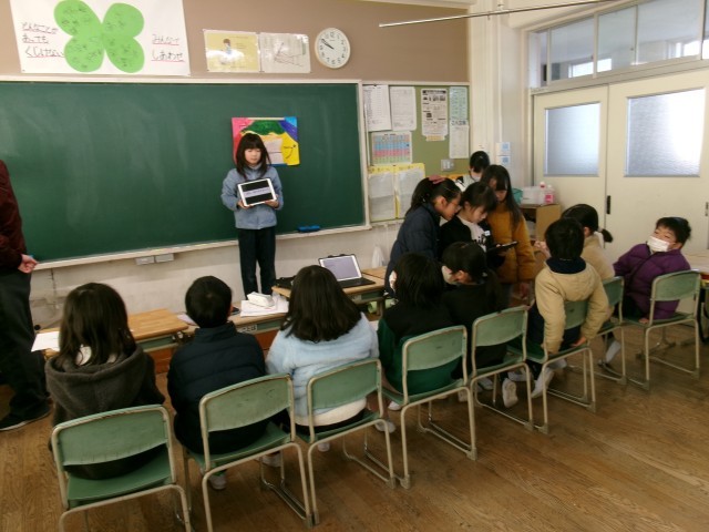 3年2組の教室では、学習発表会の発表練習をしていました。見ている子は3年1組の子です。聞いたことをアドバイスを聞いたりメモしたりしてよりよい発表を目指していました。