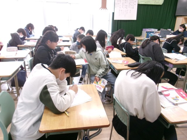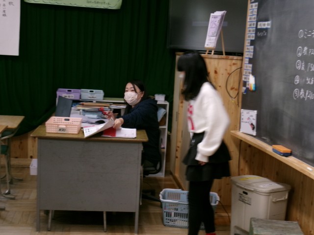 6年3組では、算数の練習問題に取り組んでいました。みんな静かに問題と向き合っていました。教師に見せてチェックしてもらっている子もいました。