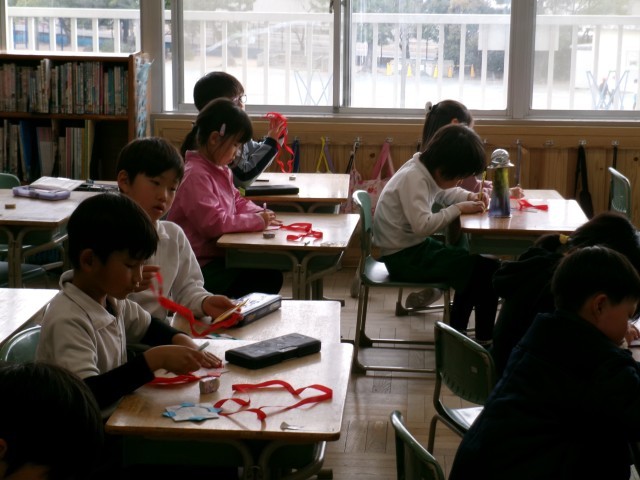 1年1組は、メダルづくりをしていました。作ったメダルにメッセージも書いていました。