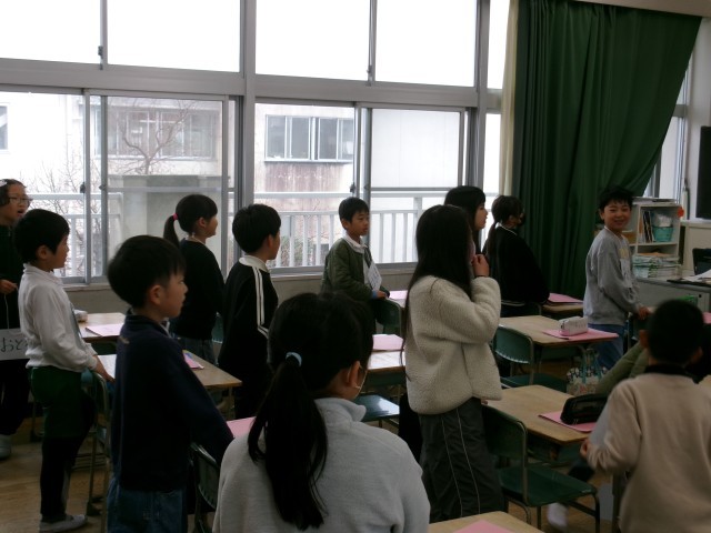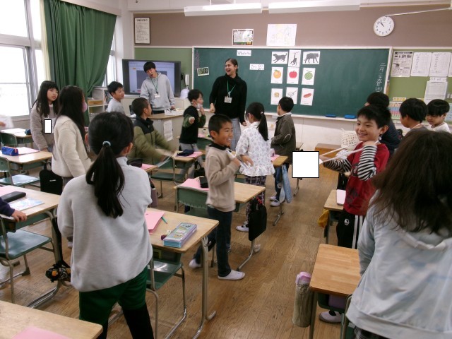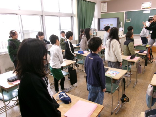 3年3組では、外国語活動を行っていました。教室を二つのチームに分け、音楽に合わせて英語でかけあいをしていました。