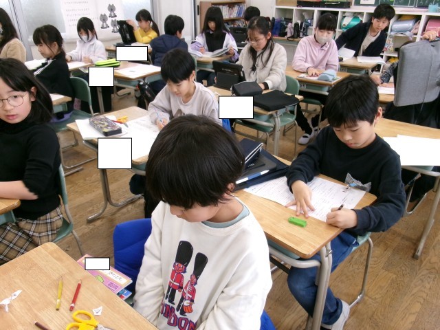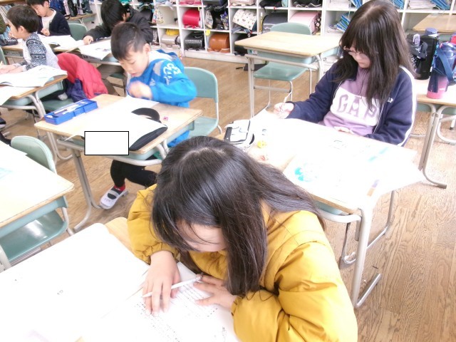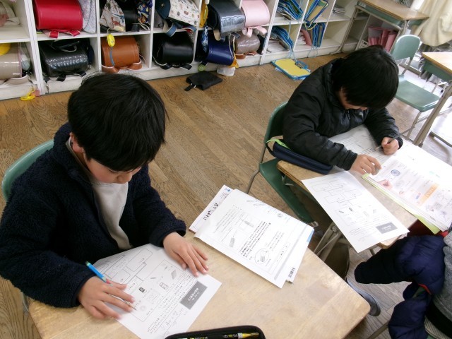 3年2組では、理科の復讐プリントに取り組んでいました。「じしゃく」の学習で引き合うもの、はじくものなど習ったことを確認していました。