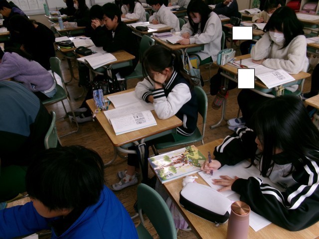 5年1組では、伝記を読んでいました。人物の名前は、手塚治虫です。手塚治虫の若い頃の話を教師が読み聞かせると、みんな真剣に聞いていました。