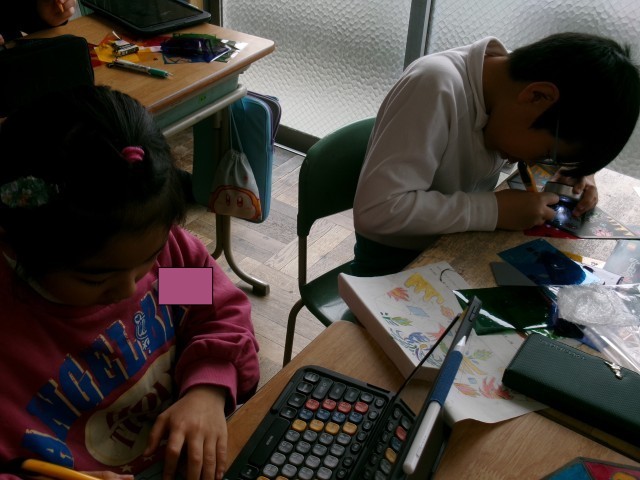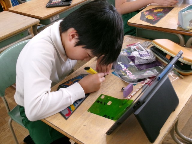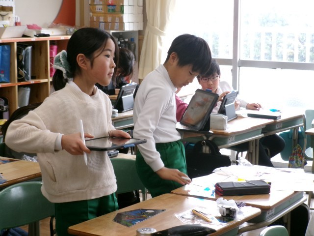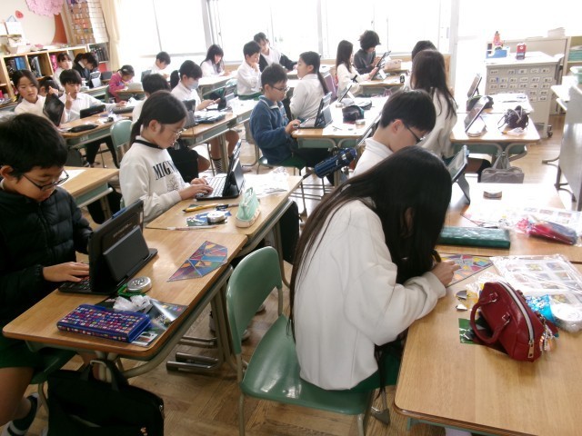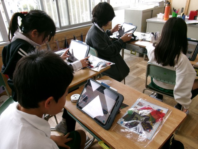 4年4組では、きれいな板をカッターナイフで切り抜いて組み合わせる制作をおこなっていました。できあがった子からタブレットで写真を撮り作品を共有してよさを認め合っていました。