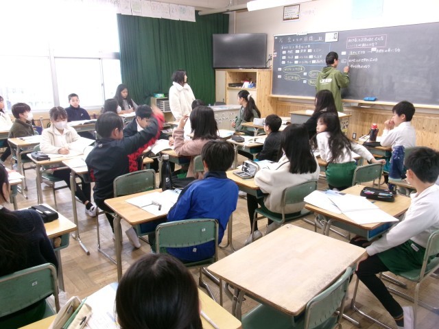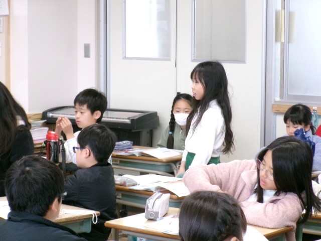 4年3組では、「空からの目線」の話を読んで考えていました。「すきなことをつづけるとどんないいことがあるのか」というテーマで意見を交流していました。
