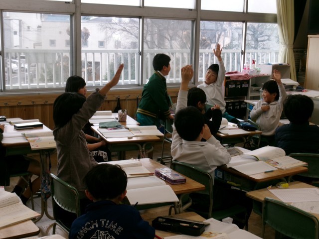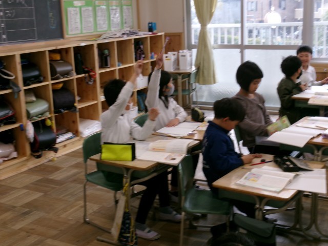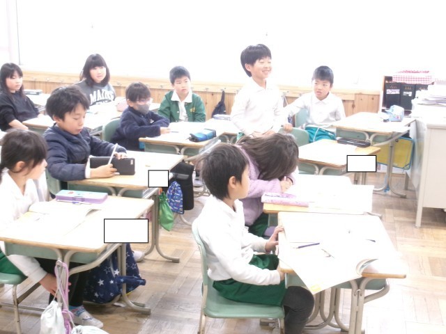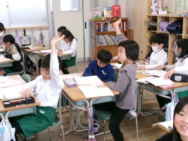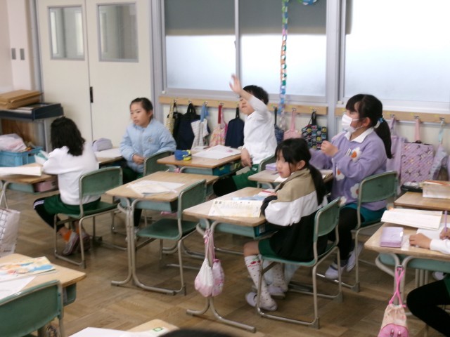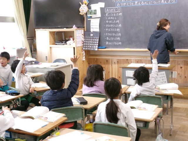 2年4組では「ありがとうの絵」を読んでいました。まず、どんなときに「ありがとう」と言われたり叱られたりするか今までの経験を発表していました。