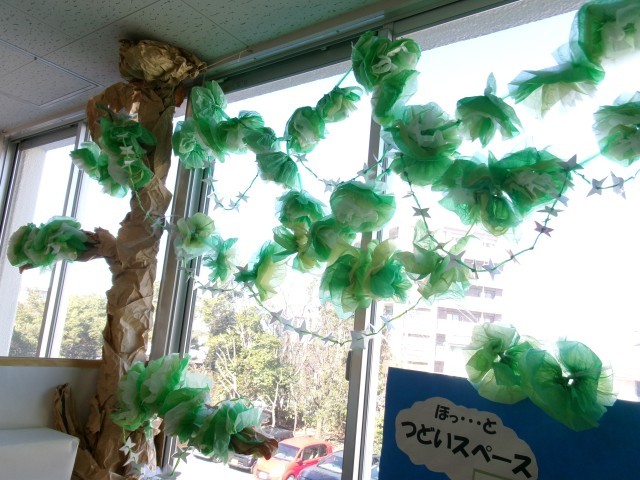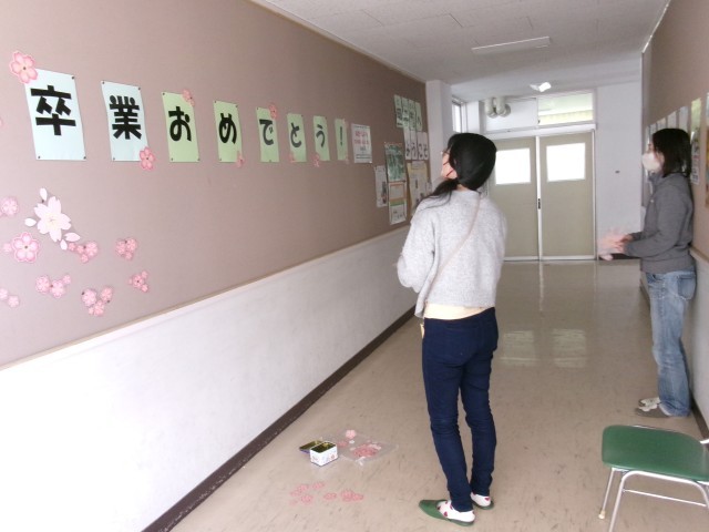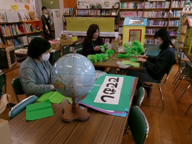 図書サポーターさんが図書掲示板や図書館の環境整備をしていました。卒業に向けての春らしい掲示を作ったりさざんかどくしょまつりで集まった花を飾ったりしてくださりました。