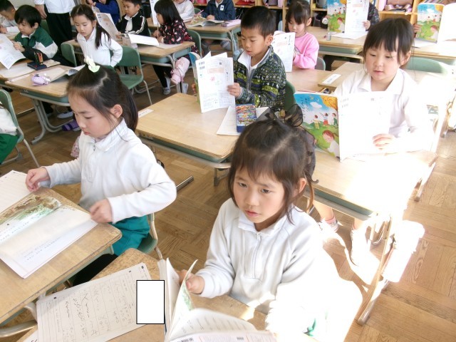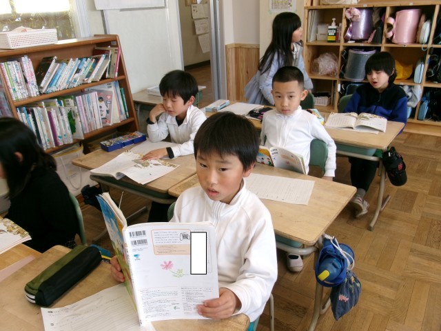 1年3組では、「スイミー」の学習をしていました。まず、教科書をもってテレビのモニターから流れる手本の朗読に合わせて音読をしていました。
