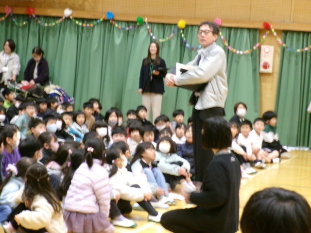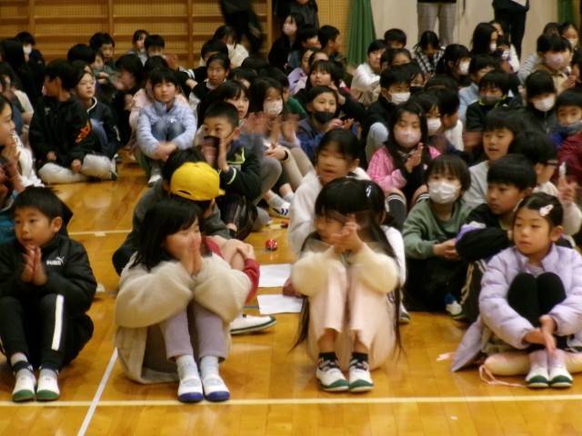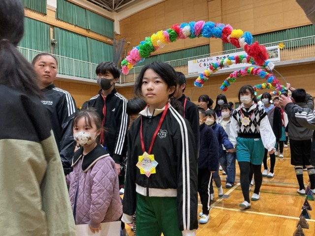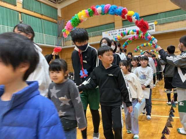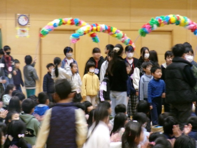 いよいよ卒業生を送る会が始まります。卒業生入場の前に拍手大会が行われ、校長先生や児童会担当教師が子どもたちの拍手を褒めていました。とてもよい雰囲気の中、6年生の入場です。大きな拍手の中、1年生に手を引かれ6年生が体育館に入ってきました。約1年前の入学式を思い出します。