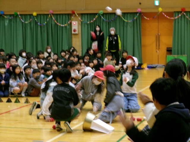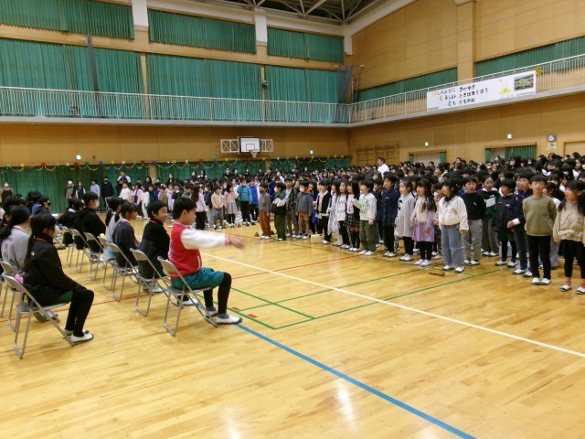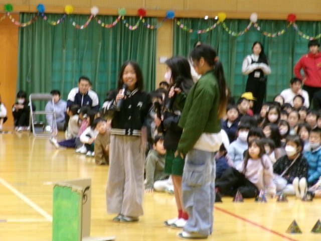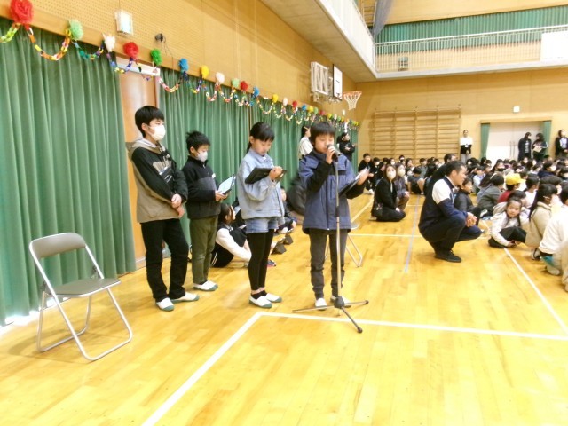 この会を企画運営した5年生から思い出スライドのプレゼントがありました。そのほか5年生は、司会や運営などで活躍していました。学年からの出し物のあと、6年生を担任したことのある教師からのメッセージがありました。最後在校生の全校合唱で卒業を祝いました。