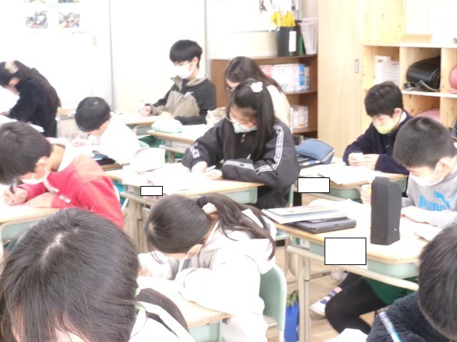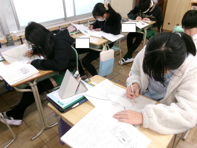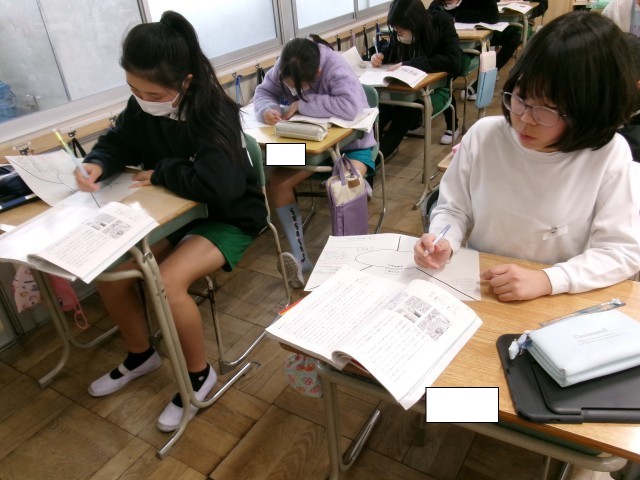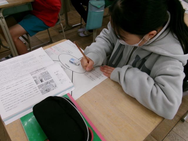 5年4組では、手塚治虫の伝記を読んでワークシートにまとめていました。「まんが家」「子ども」などのキーワードごとに記述を書きだし、思ったことを赤字で書いていました。