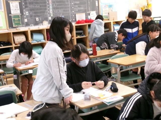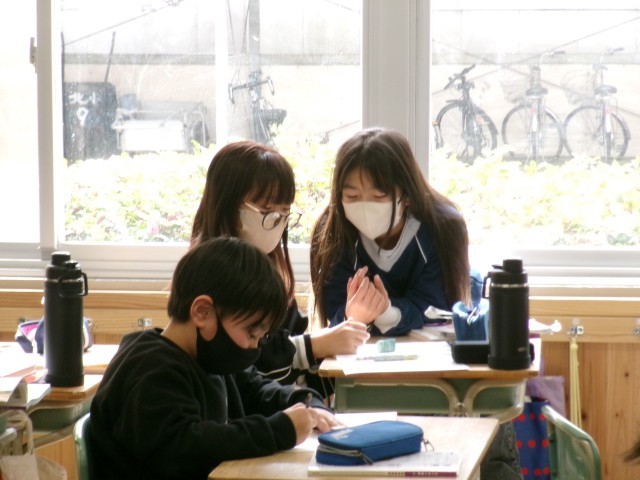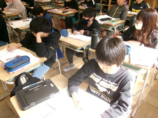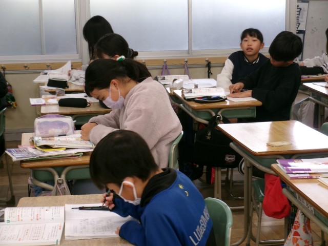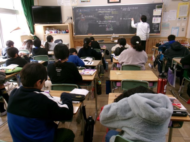 5年3組では、算数の速さの学習をしていました。教師が黒板に問題を書くと、まず自分で解いてみて、その次に友達と解き方などを確認していました。