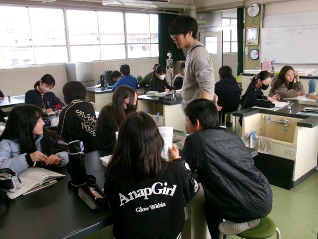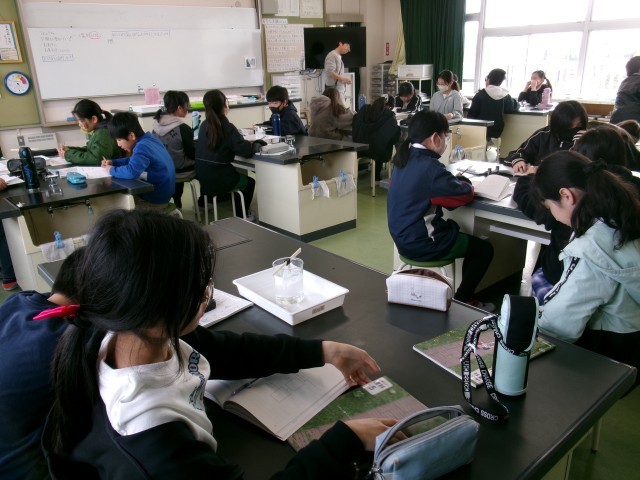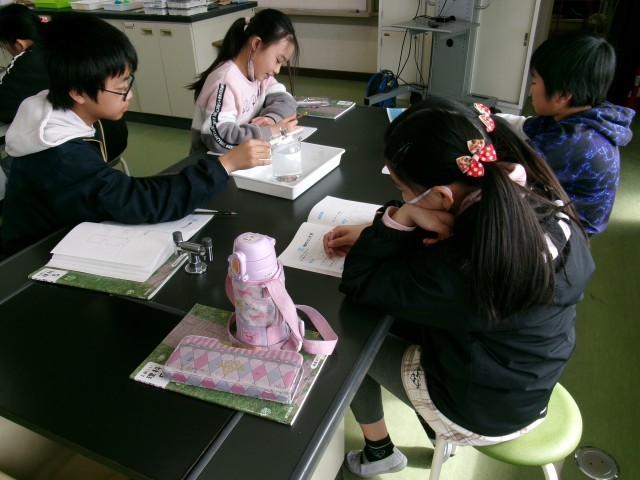 5年2組が、理科室で実験をしていました。ティーパックに入れた塩が水に入れてなくなった実験をしたあと、塩がどこに行ったか考えました。「空に消えた」「水に溶けた」などいろいろなつぶやきが出ていました。