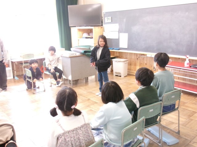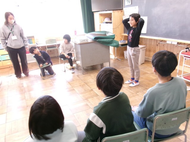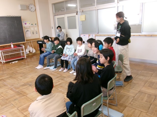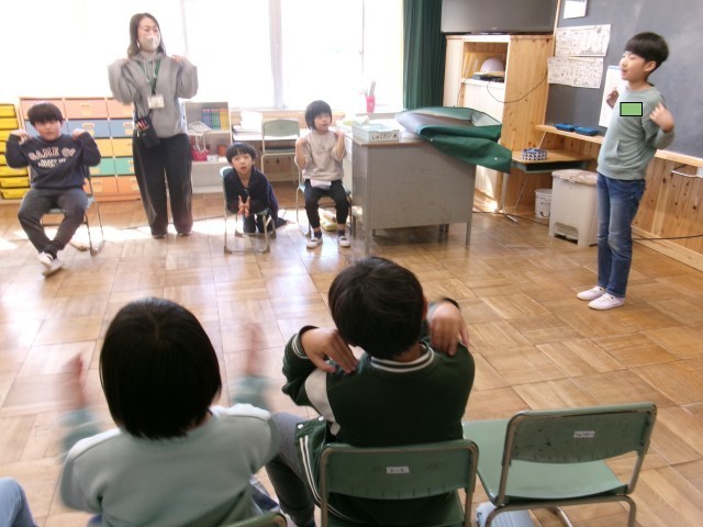 いずみ学級では、音楽の授業を行っていました。「あたま かた ひざ ぽん」では、代表の子が前に出て自分のいろいろな体の部位を触りながらリズムに乗って楽しそうに歌っていました。