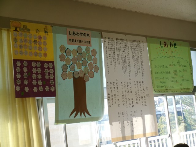 6年4組の教室の掲示です。「しあわせ」に向かってできることや「しあわせの木」が飾られています。安城北部小学校では、各クラスの担任と子供たちが工夫を凝らして「しあわせ」を実現するための取組をしています。