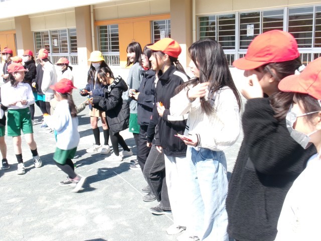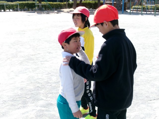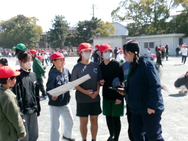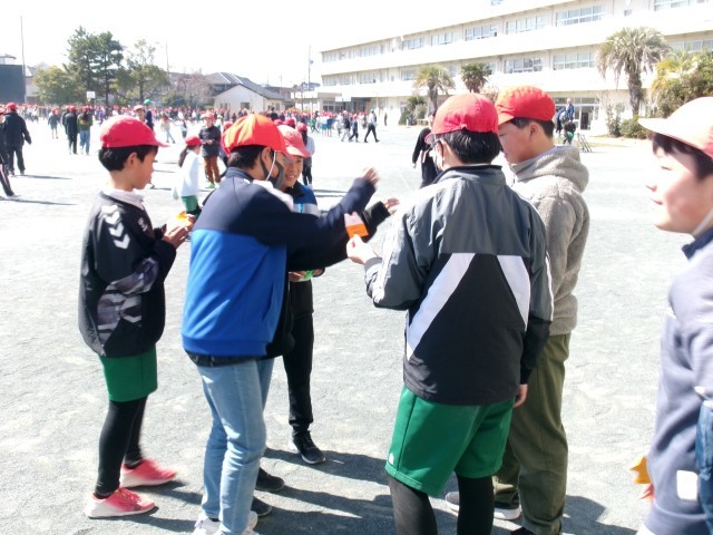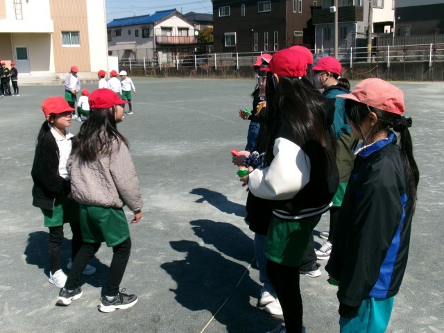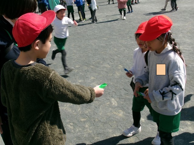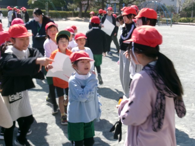 6年生が来週に控えた卒業式を前に卒業プロジェクトの一環として在校生に向けてレクリエーションを企画してくれました。その名も「借り6年生」。借り物競争のように地面に置いてある画用紙を見て6年生のところへ行って話をしたり、メッセージ付き折り紙をもらったりしていました。6年生のもとに行く在校生も、在校生を待つ6年生もよい笑顔で、最後のふれあいを楽しんでいました。レクリエーションが終わった後、集めた折り紙を手に嬉しそうに教室に帰る在校生たちがたくさんいました。6年生の皆さん、素敵な企画をありがとうございました。