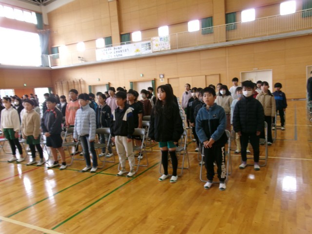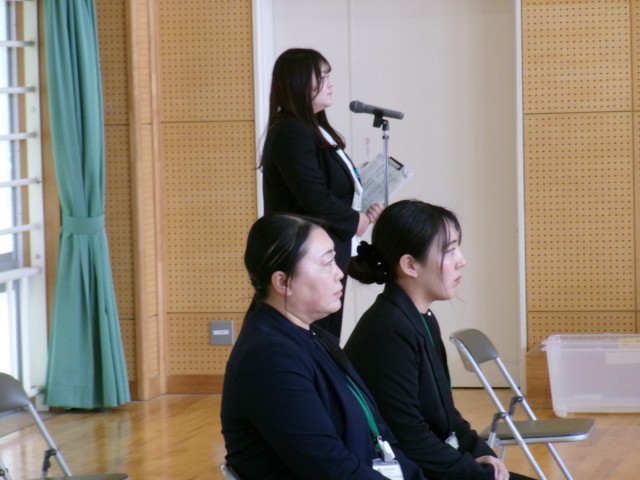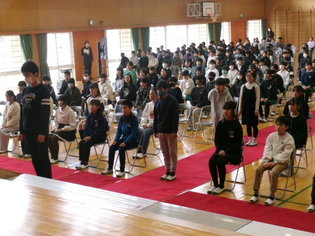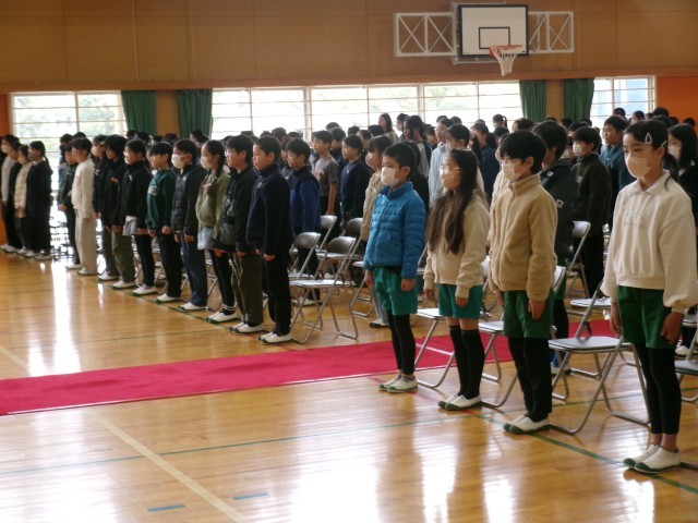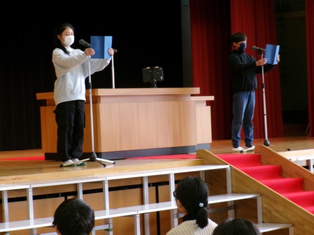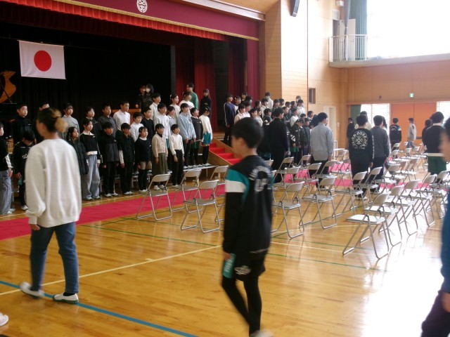 6年生の動きを見て、在校生も背筋が伸びます。在校生お祝いのことばでは、代表児童がしっかり思いを伝えました。続いて6年生がひな段に移動します。