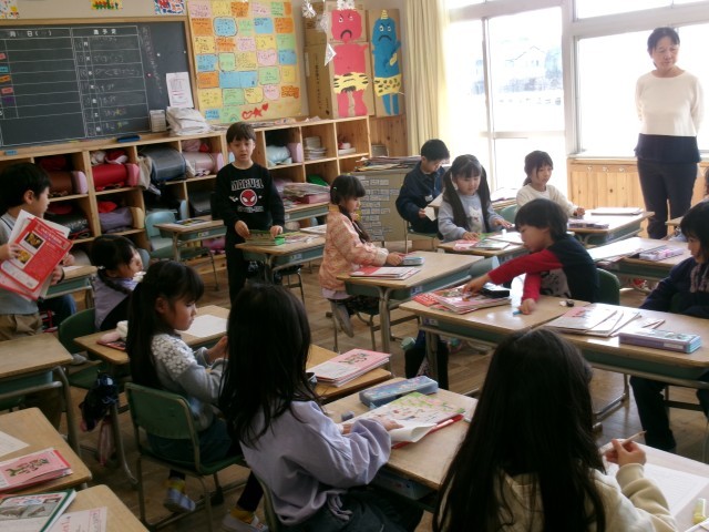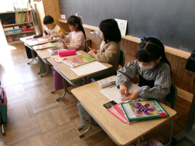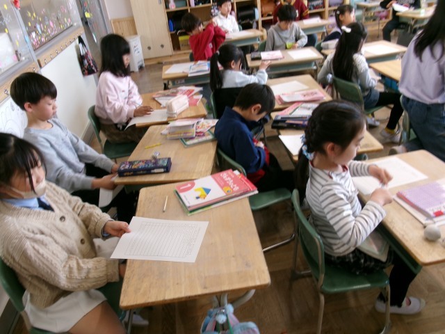 1年2組では、進級に向けて荷物の整頓をしていました。チェック表を見ながら、2年生の教室にもっていくものを確認していました。