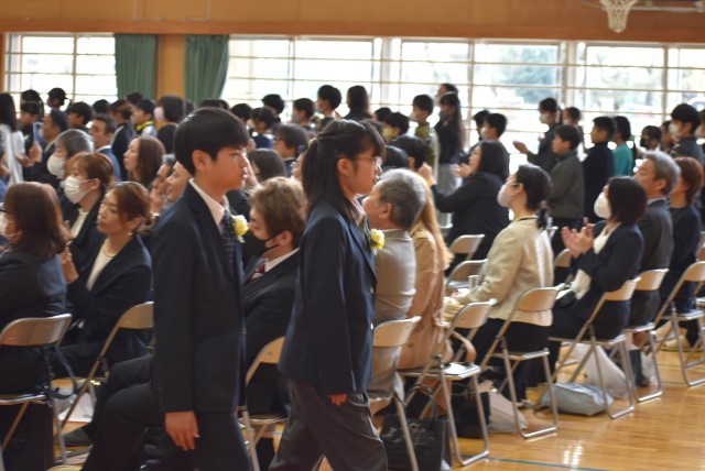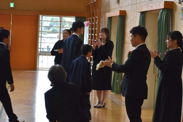 退場です。たくさんの温かい拍手に包まれて卒業生が退場していきました。卒業生の皆さんの「これからもしあわせ」を応援しています。健康に気をつけてがんばってください。