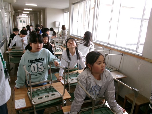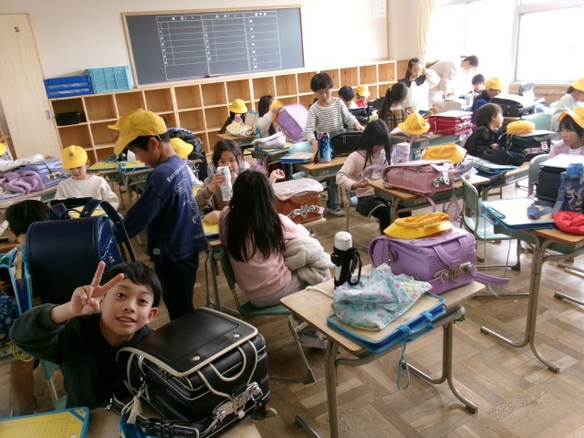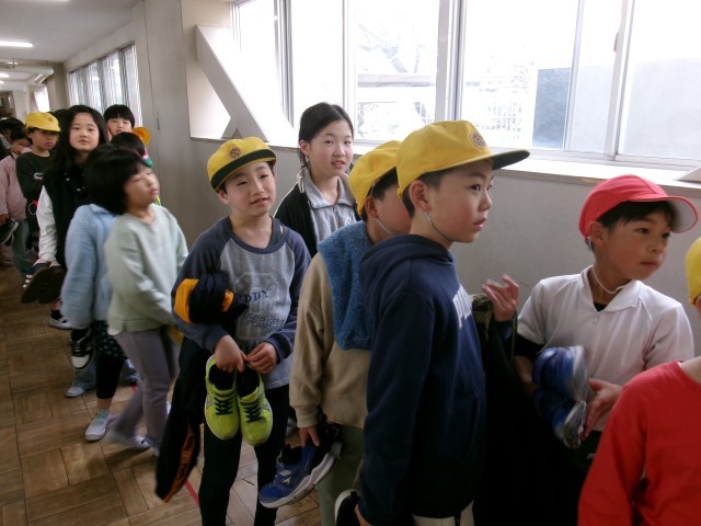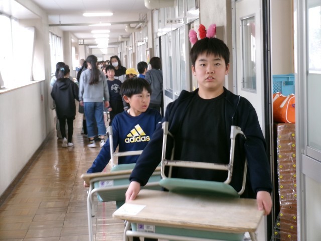 各学年、来年度の教室に移動しました。まず、靴の移動、続いて机や椅子を4,5年生が運びます。今まで使っていた教室に「さようなら」「ありがとう」と別れを告げて移動しました。子どもたちのわくわくした顔が印象的でした。
