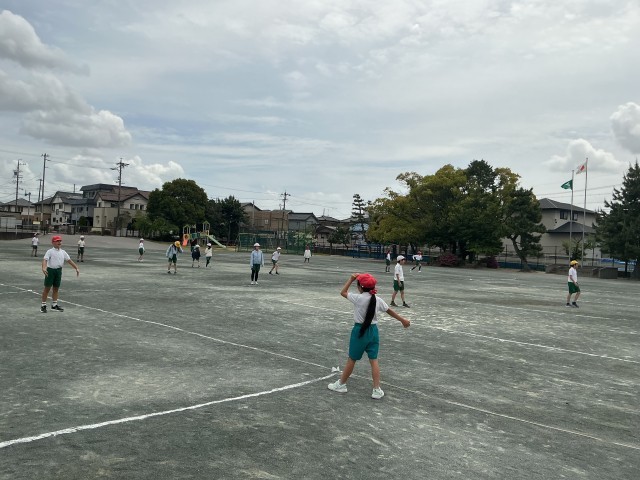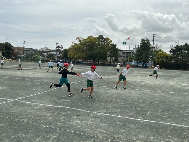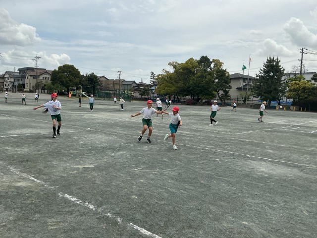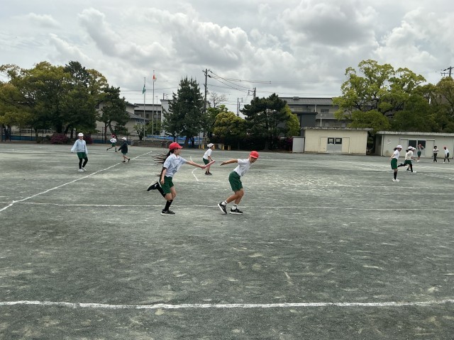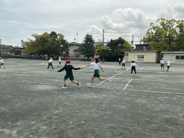 5年4組では、体育でリレーの練習をしました。バトンパスをチームに分かれてそれぞれ工夫して行なっていました。