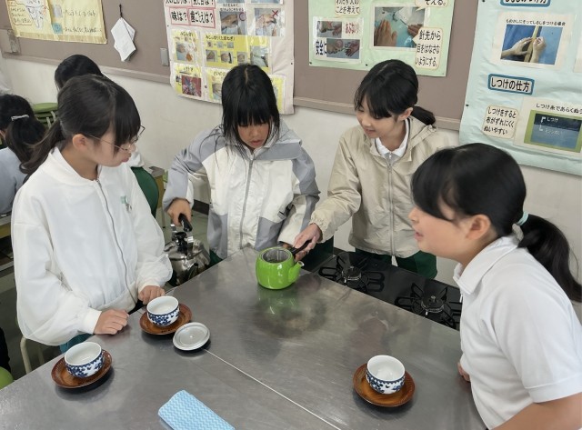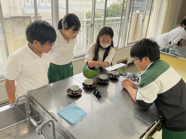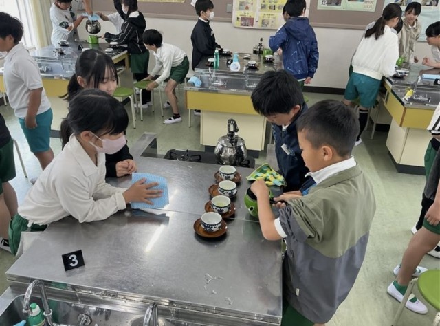 5年3組では、家庭科でお茶をいれていました。ガスコンロの使い方とお茶のいれかたを学習しました。お茶をいれる順番があることを知りました。