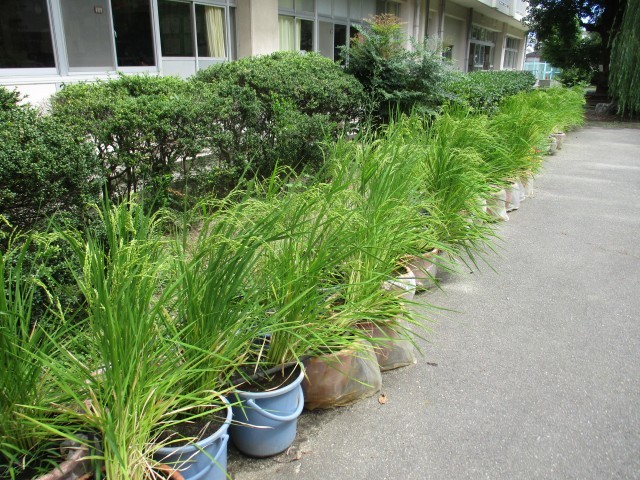 まだ、暑い日が続きますが、5年生が育てている稲の穂に実が付いてきました。メイン花壇のジャンボカボチャの雌花のもとも、大きくなってきました。