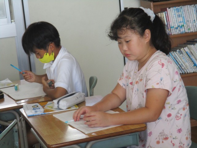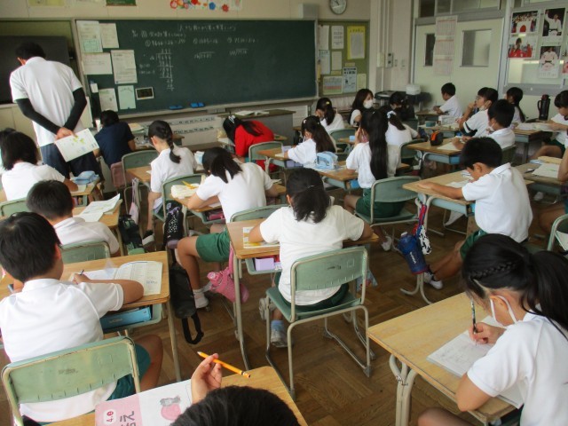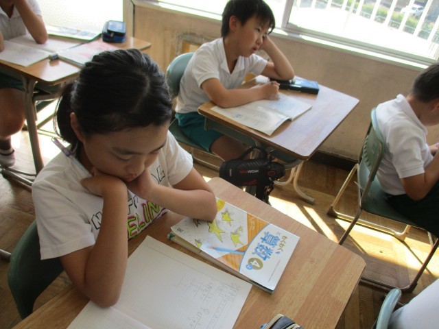 4年2組では、大きな数の割り算の学習をしていました。筆算のどこに商を立てたらよいかをみんなで確認してから、各自で問題を解いていました。