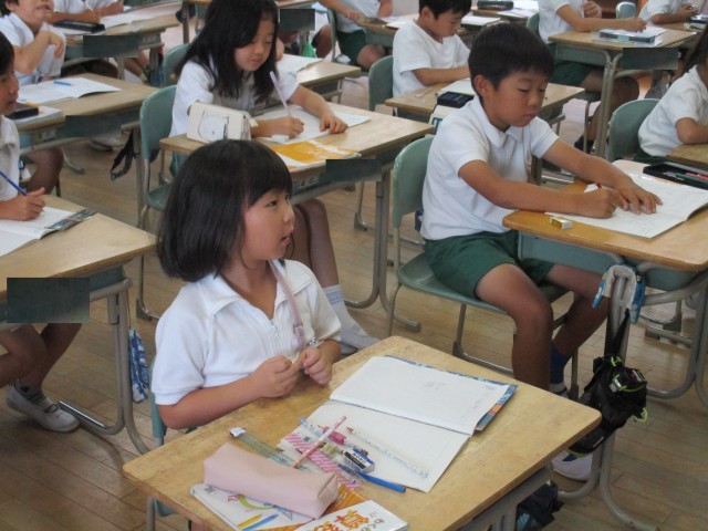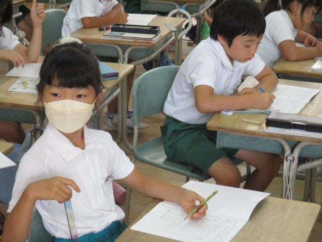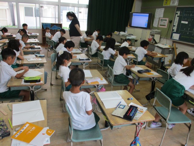 2年4組では、2つの位で繰り上がりのある足し算の筆算の学習をしていました。どんな順序で計算したらよいか学んだあと、計算問題に取り組みました。