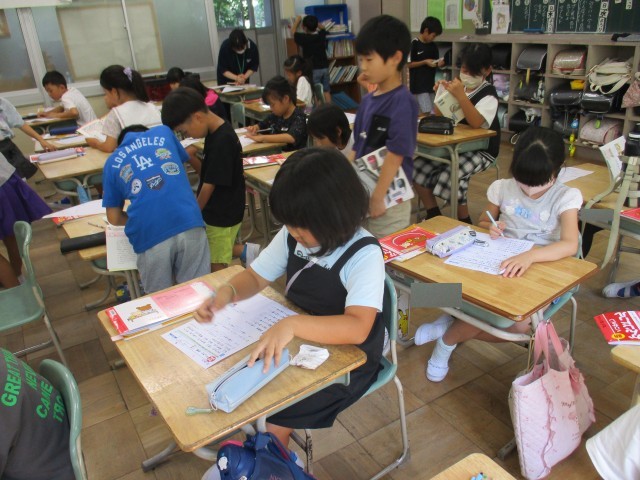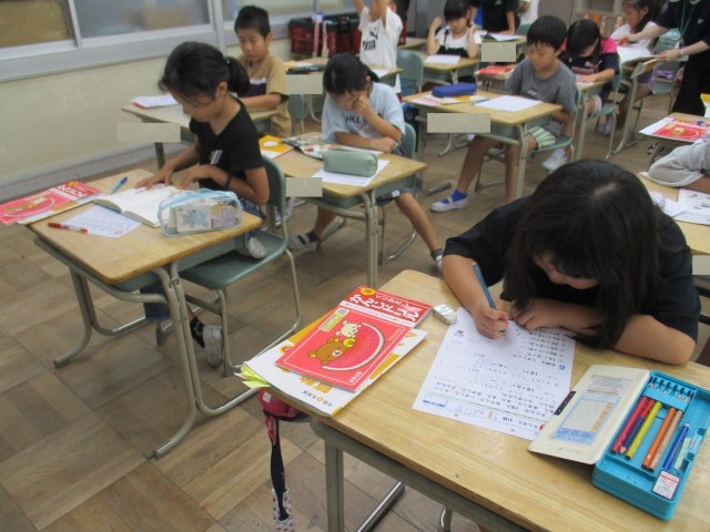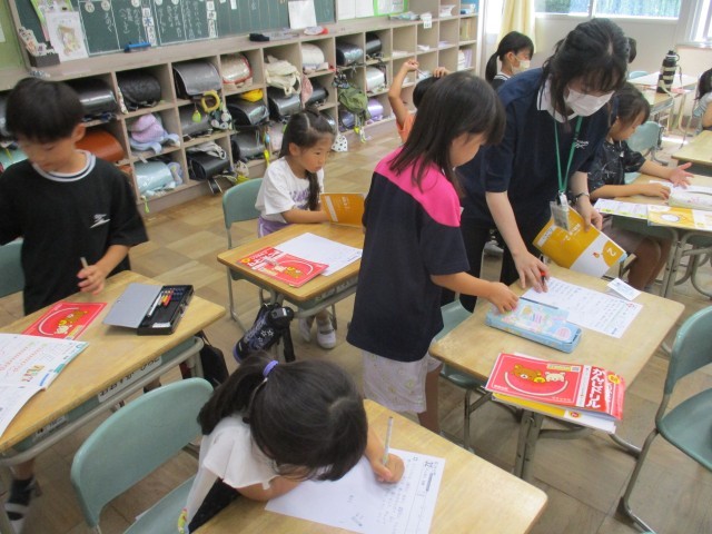 2年2組では、漢字の問題集や算数のプリントを使って学習をしていました。一人で問題に取り組む子や教師や友達とやり方を確認している子もいました。