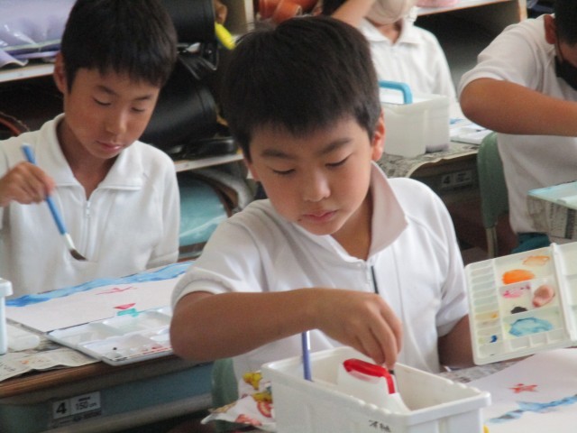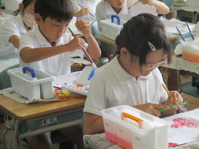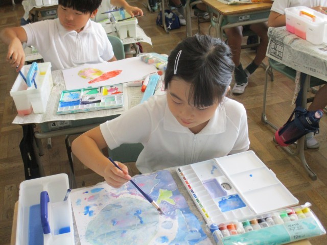 3年1組では、絵の具を使って、「にじんで広がるものがたり」の制作をしていました。白いクレヨンで描いた絵に、水をたっぷり含めた絵の具で塗ったり、筆をはじかせて模様を付けたりして工夫して描いていました。