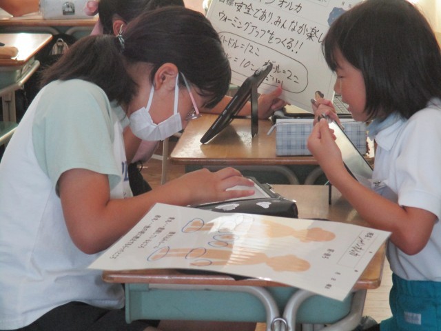 5年1組では、昨日行ったアップの様子を振り返っていました。どこをどう動かしたら、どの体の部分を鍛えられるかグループごとに真剣に話し合っていました。