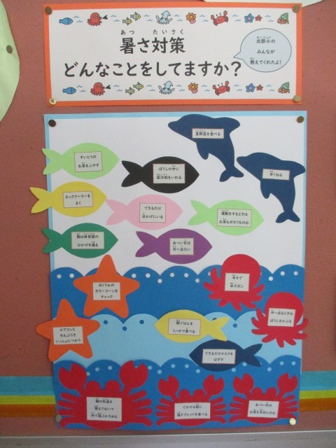 まだ暑い日が続きます。保健室の廊下には、暑さ指数が掲示されています。午前10時は、「30.1」でした。北部小の子が考えた暑さ対策も掲示されています。熱中症に気を付けて、活動していきましょう。