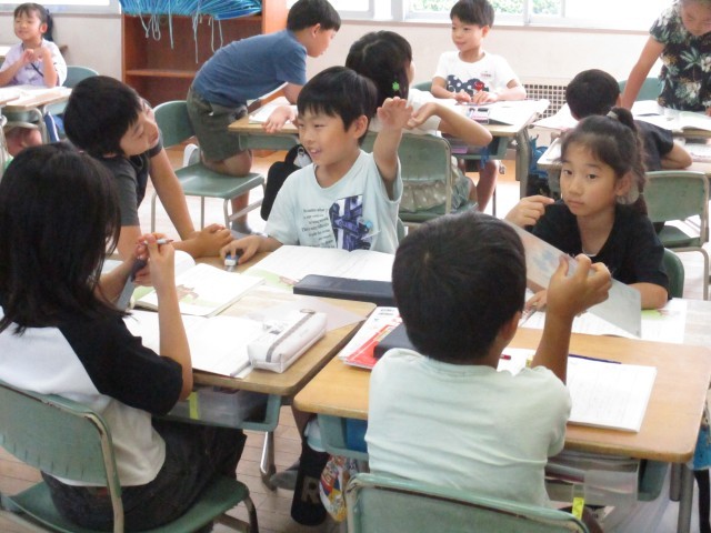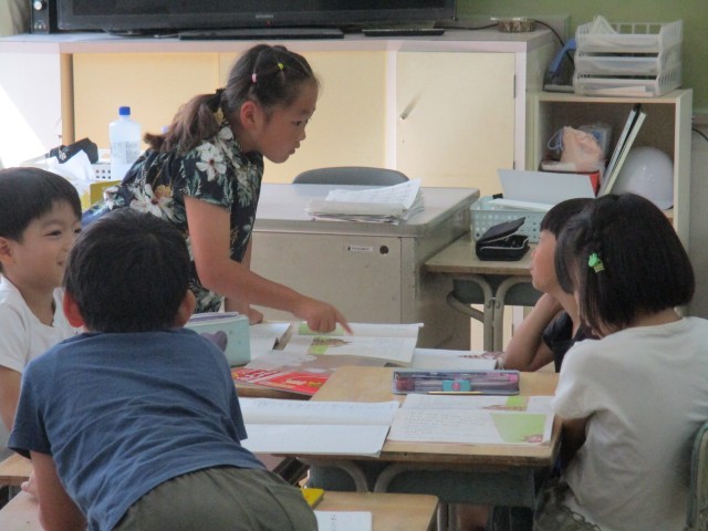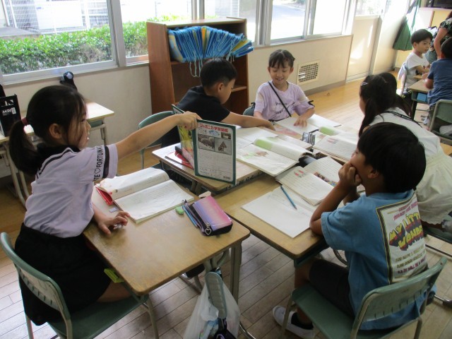 2年4組では登場人物の気持ちを考える授業を行っていました。自分で考えた後、班になって意見を交流している場面では、ノートを見せたり指で本文をさしたりしながら、自分の考えを一生懸命伝えていました。