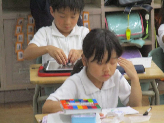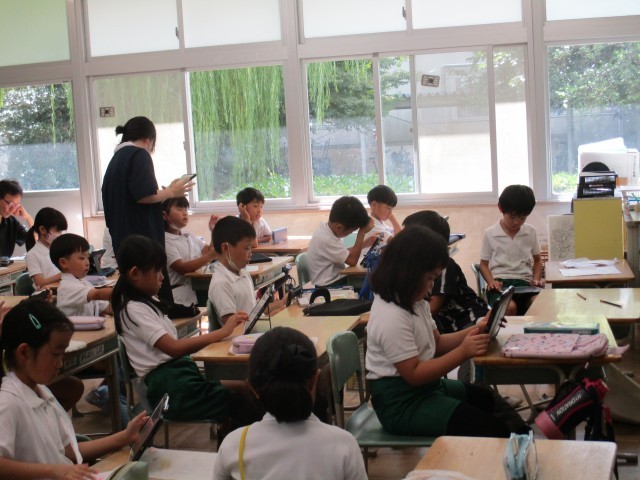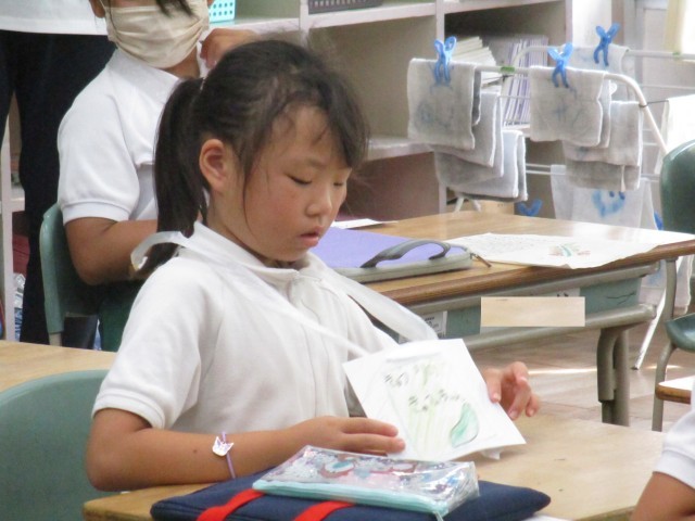 2年2組は、夏休みの野菜日記の発表の時間でした。まず、自分で育てている野菜の名札を作り、うれしそうに首にかけていました。野菜の様子を記録した写真を見ながら思い出し、発表しました。