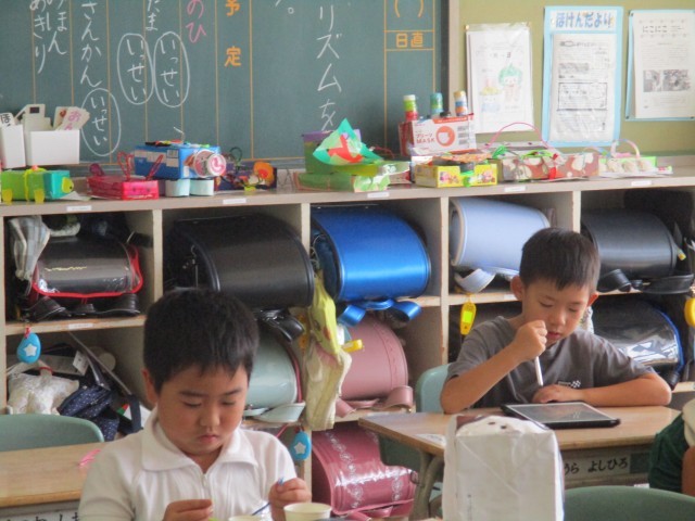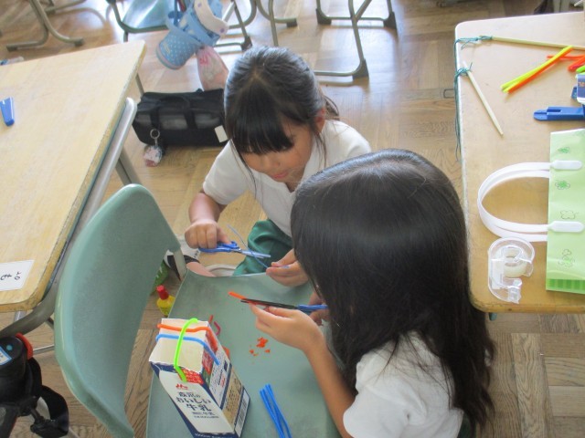 1年4組では、シャボン玉の授業を行っていました。どう工夫すれば、おもしろいかシャボン玉ができるか、針金などに毛糸を巻きながら考えていました。