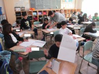 2年4組では、それぞれに準備した材料を使っておもちゃを作っていました。ビニールの袋を凧やパラシュートに、トレイを船になど工夫して制作に取り組んでいました。