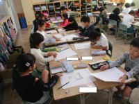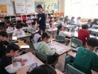 いずみ4組では、教師の伴奏に合わせて体を動かしていました。リズムに乗せて手を大きく動かしました。