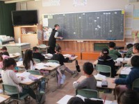 1年4組では、鬼のお面を作っていました。いろいろな色の肌と髪の毛の鬼が描かれていました。描けた子は丁寧に切り取って教師にお面にしてもらっていました。