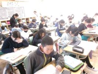 5年3組では、外国語の学習をしていました。プリントを使った学習で、英語で名前を書くとき、大文字やスペース、三本線のどこに書くかを教師と一緒に確認していました。