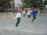 2年3組が運動場でリングをもっていろいろな走り方をしてました。コーンをジャンプ...