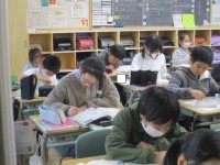 5年4組では、「情報を生かす産業」のまとめを行っていました。資料集を見ながらカードにまとめていました。家庭科の小物づくりをしている子もいました。